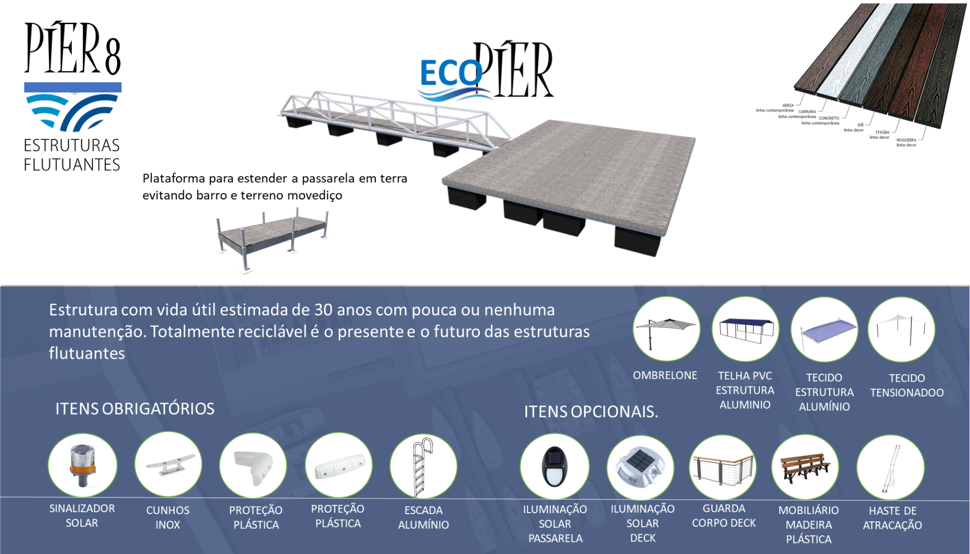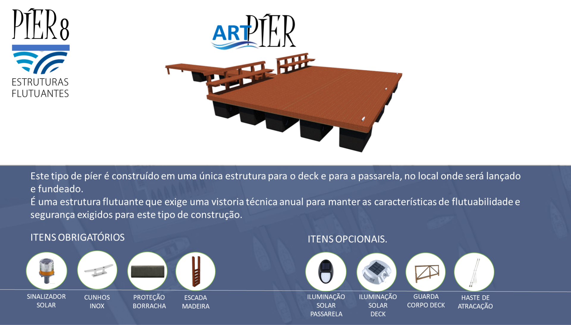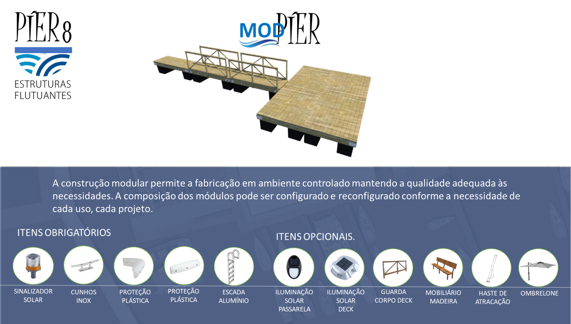 Uma nova geração de píeres com estrutura de madeira certificada e flutuadores tubulares, com maior segurança, estabiçidade durabilidade.